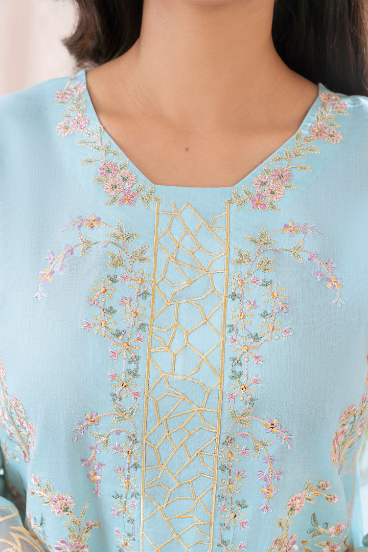 Shirt: Sky blue Embroidered front panel, an embroidered motif at the back, round neckline, full sleeves with cutwork borders