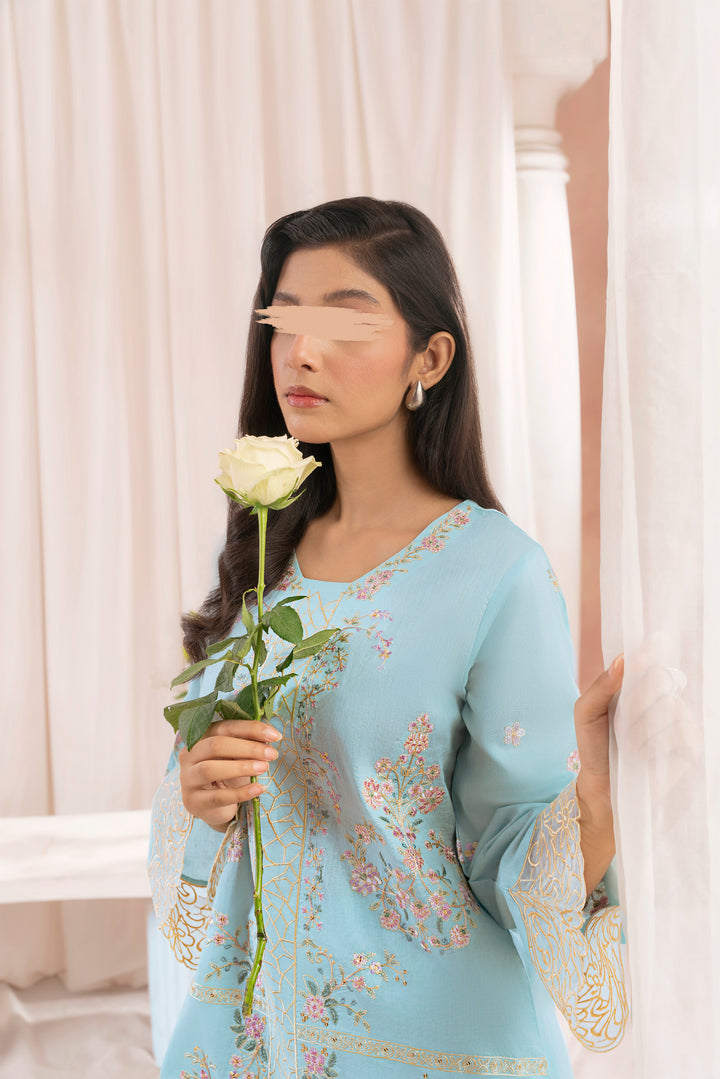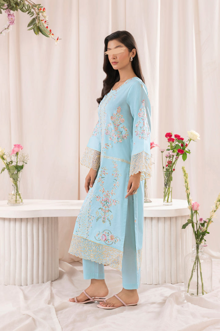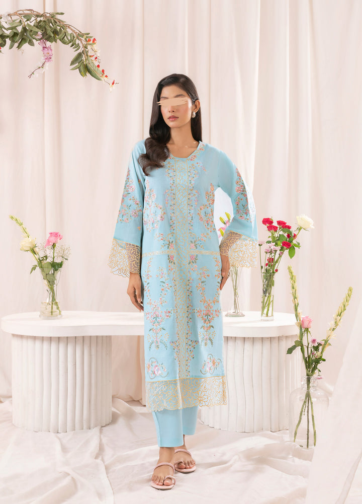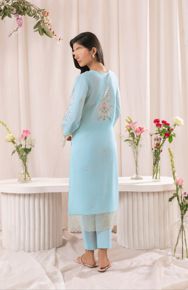 Elevate your style with this exquisite two-piece lawn ensemble in a refreshing sky blue. The intricately embroidered top features a beautifully detailed front panel, an embroidered motif on the back, and full sleeves adorned with elegant cutwork borders. Paired with sleek, straight-cut pants, this outfit is perfect for any occasion, blending sophistication with comfort.