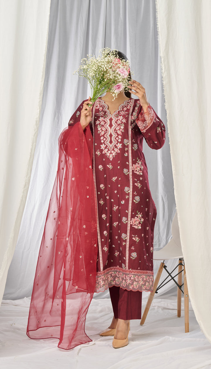 This gorgeous embroidery stands out. The design showcases floral patterns with sitara work complemented by hand work that create a stunning contrast against the rich maroon background, adding a touch of elegance. The floral embroidery adorning the neckline adds an exquisite and charming detail. It comes with straight pants and a maroon organza dupatta, adorned with floral embroidery and lace details perfectly matches the shirt.