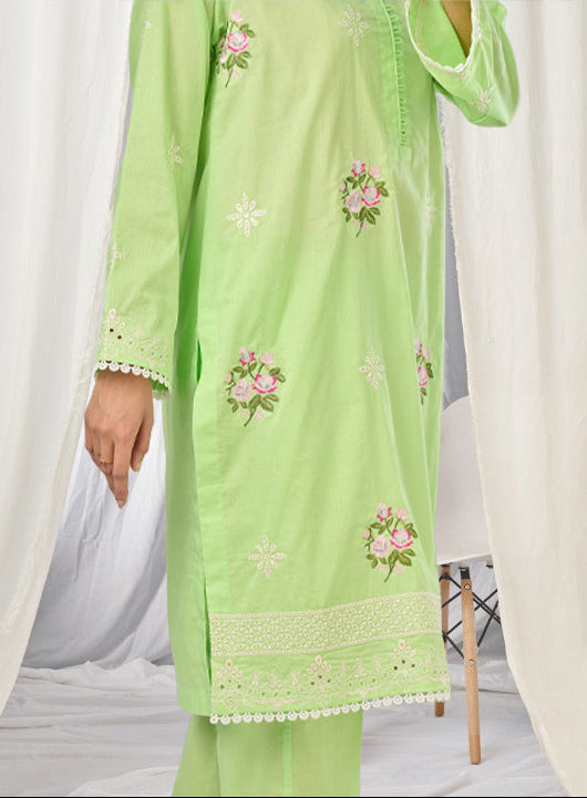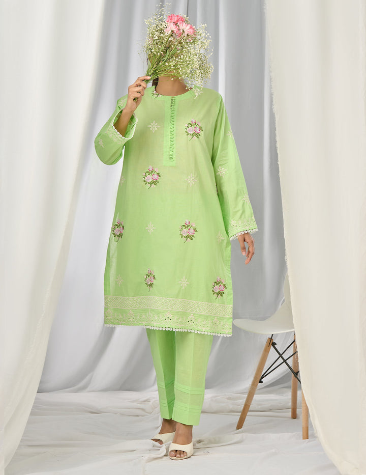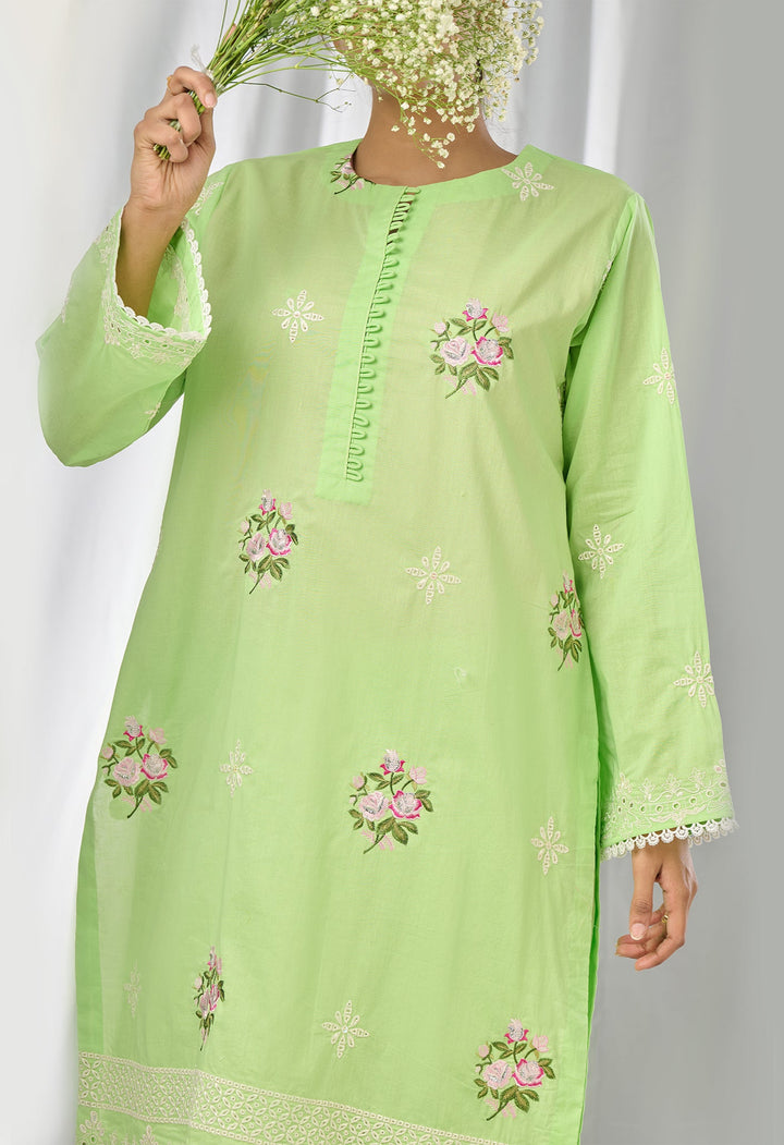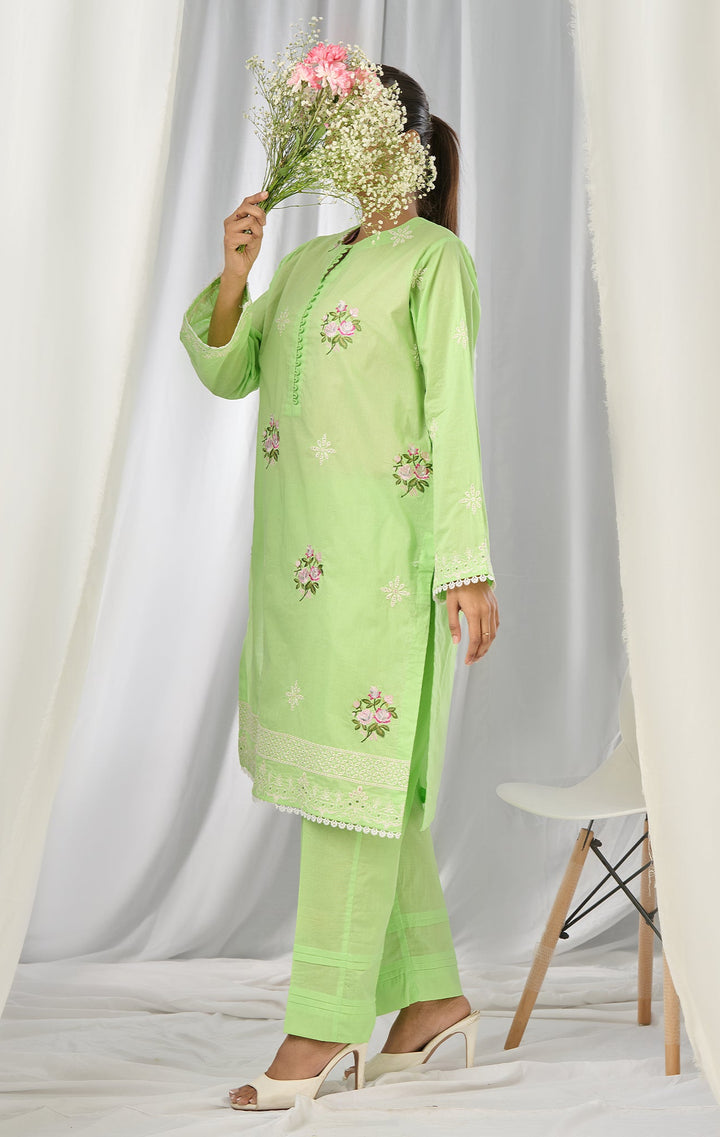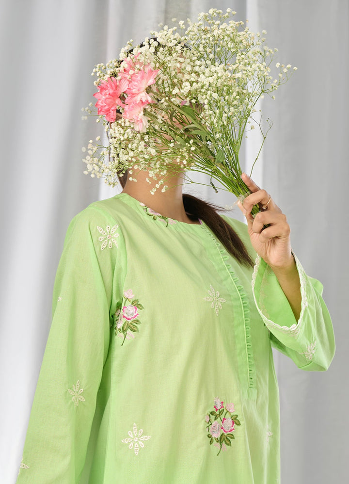 Make a statement with our green floral embroidered shirt, designed with a