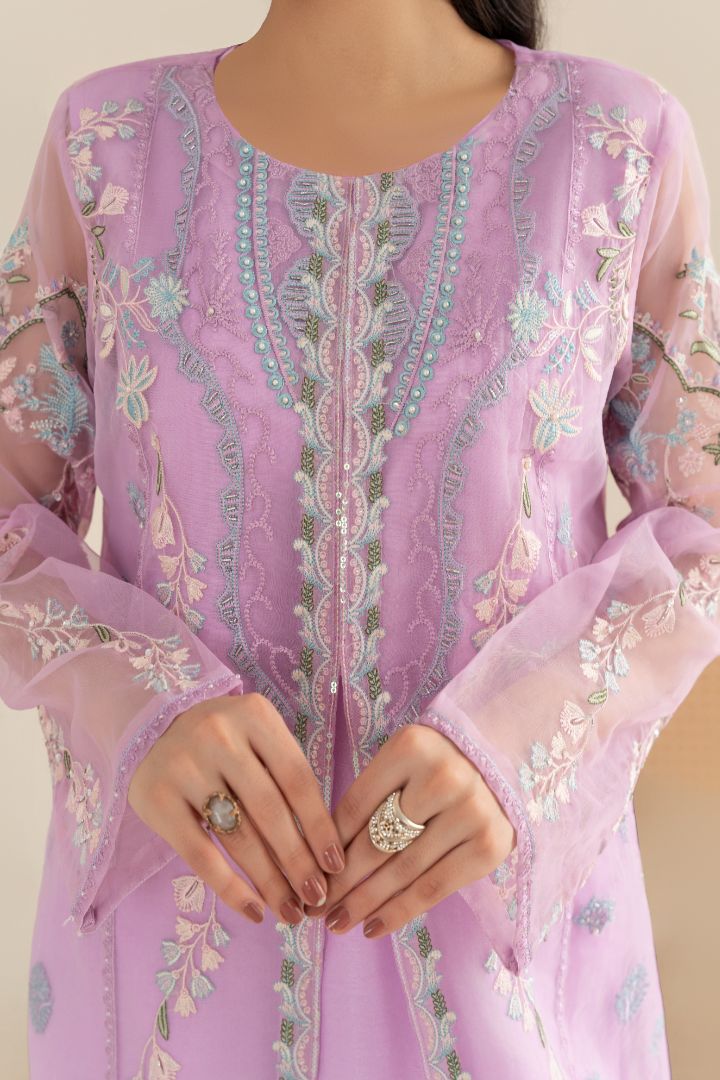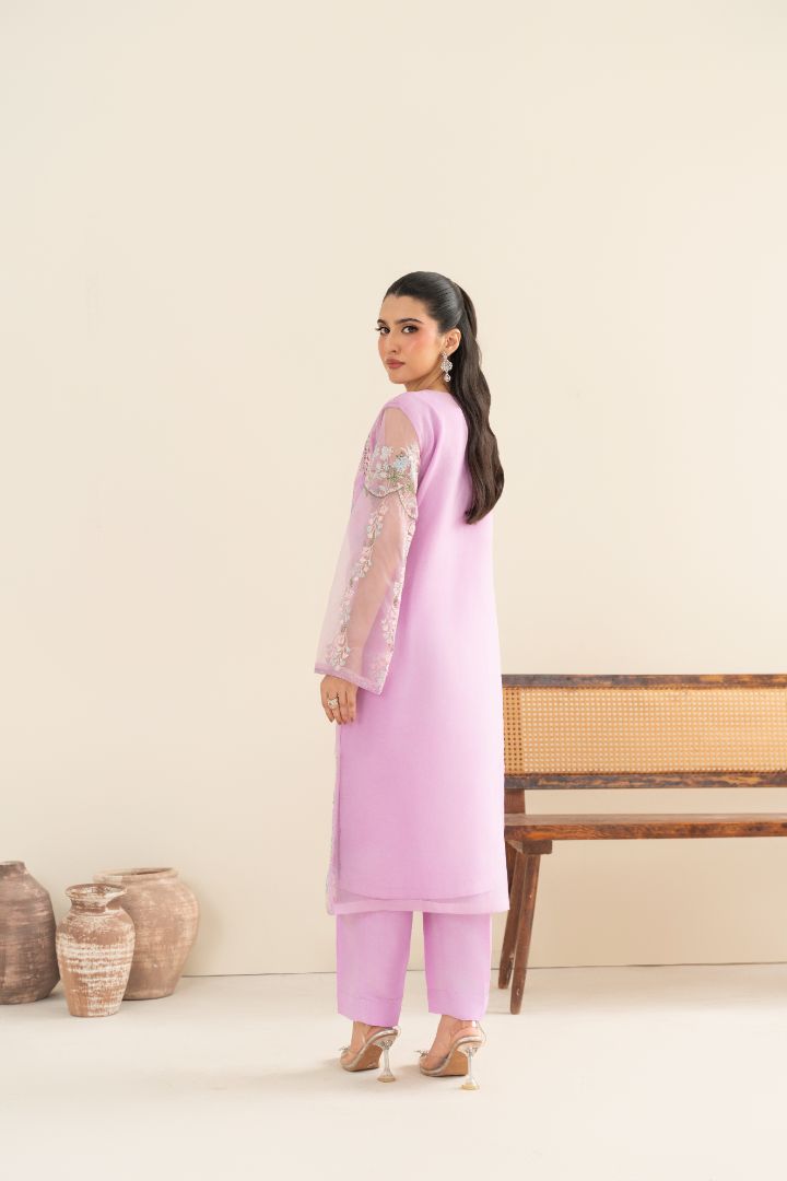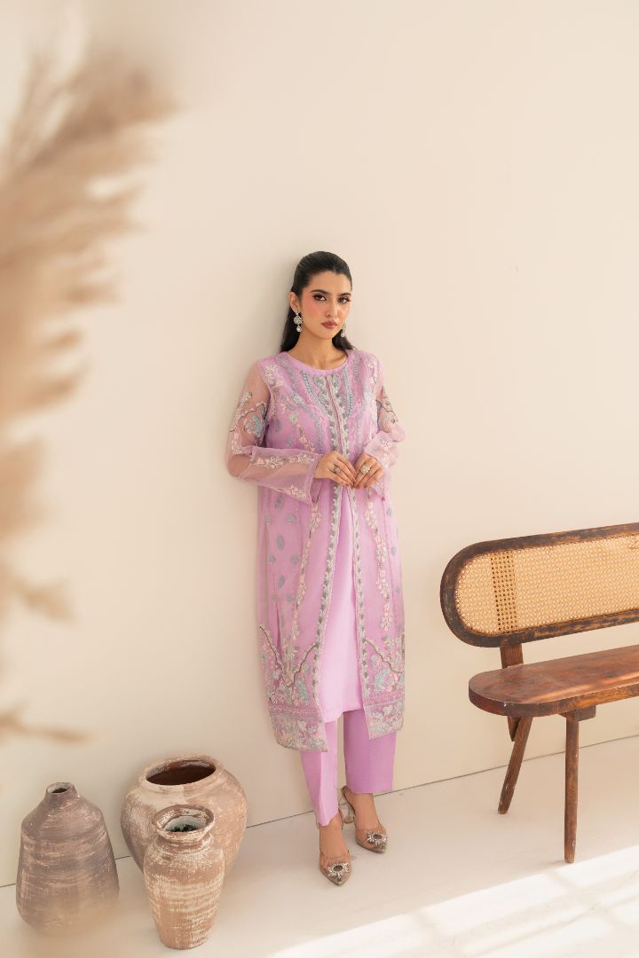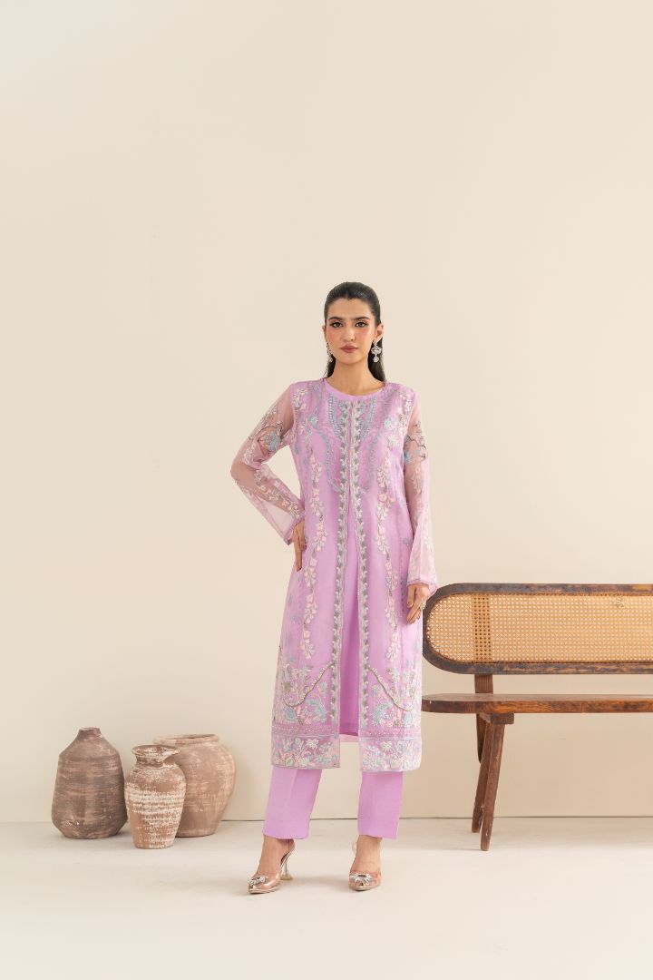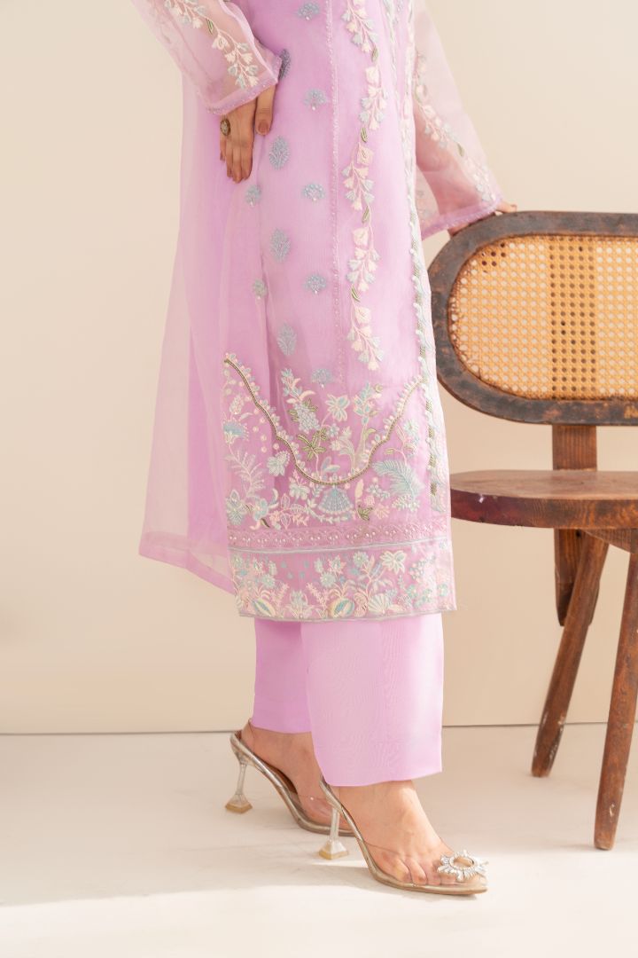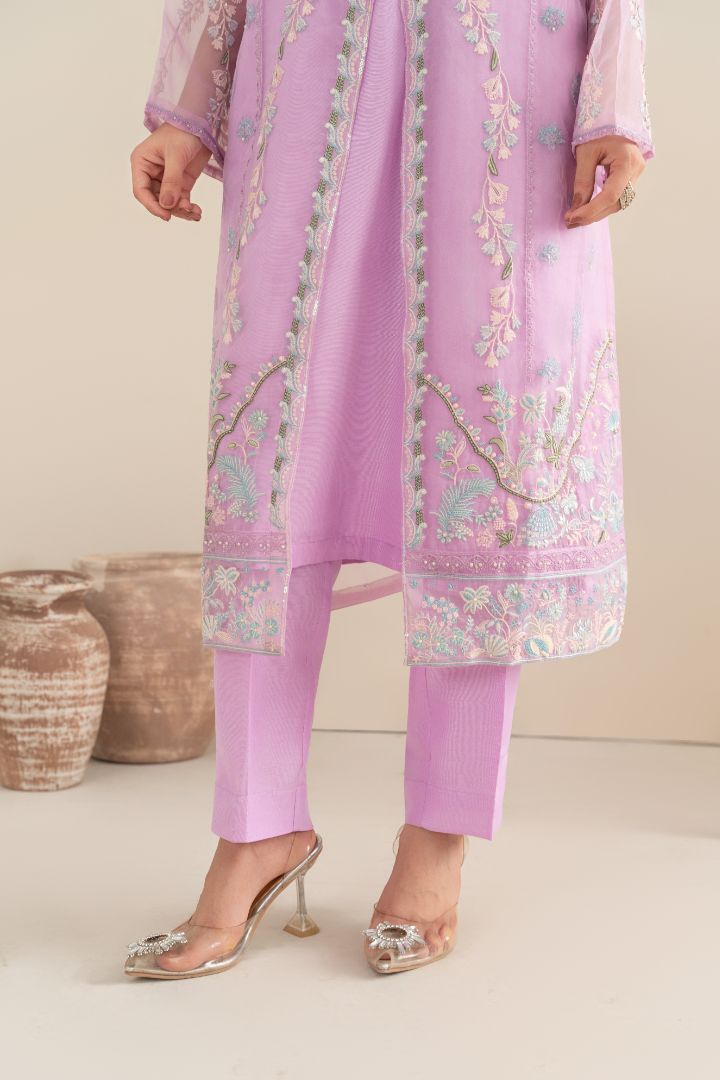 This beautiful outfit features a lovely soft pastel color lavender and detailed embroidery with handwork. The lavender inner top, with its fine details and a flowing lavender organza jacket with detailed embroidery and delicate pearls, paired with straight pants finishes the look. Giving it an elegant and sophisticated touch. This ensemble is ideal for formal events and anyone who loves the charm of pastel shades.