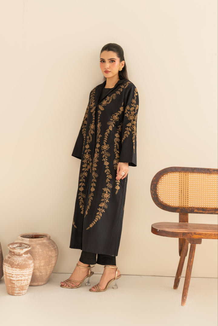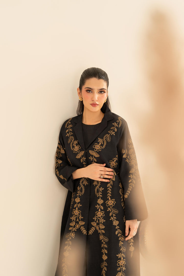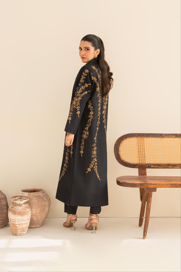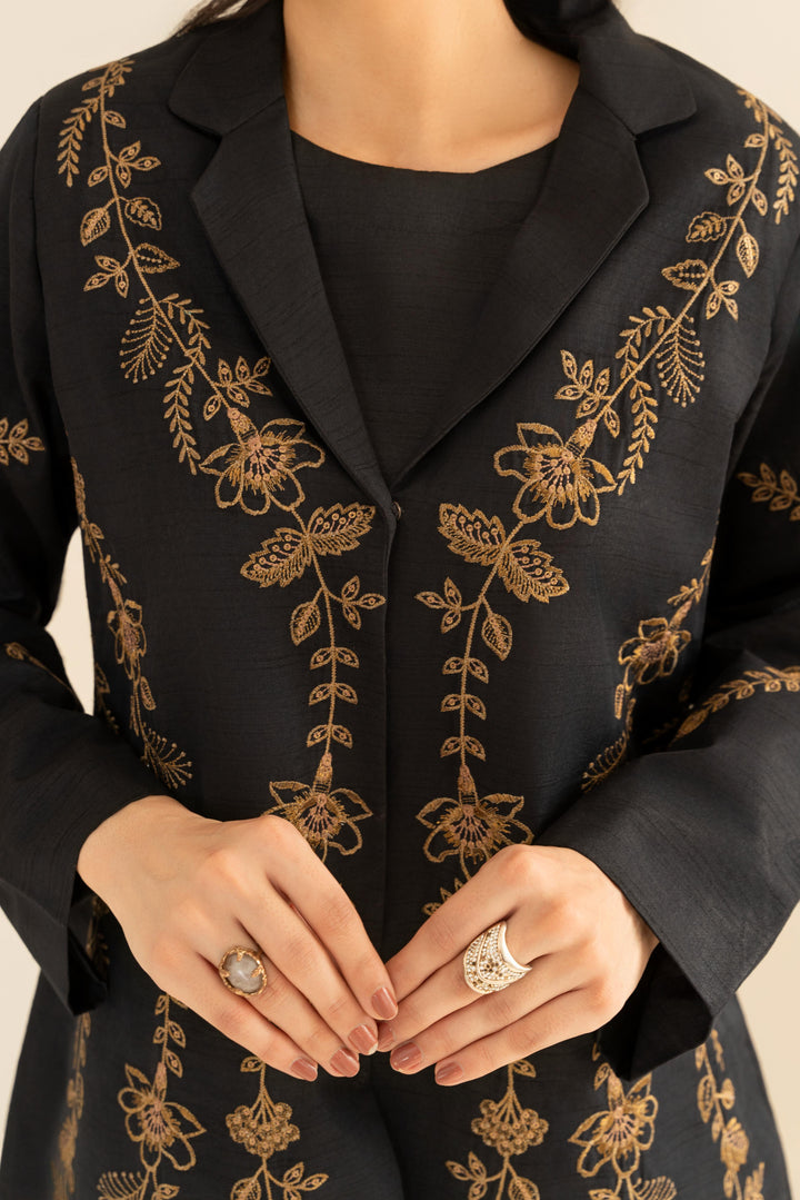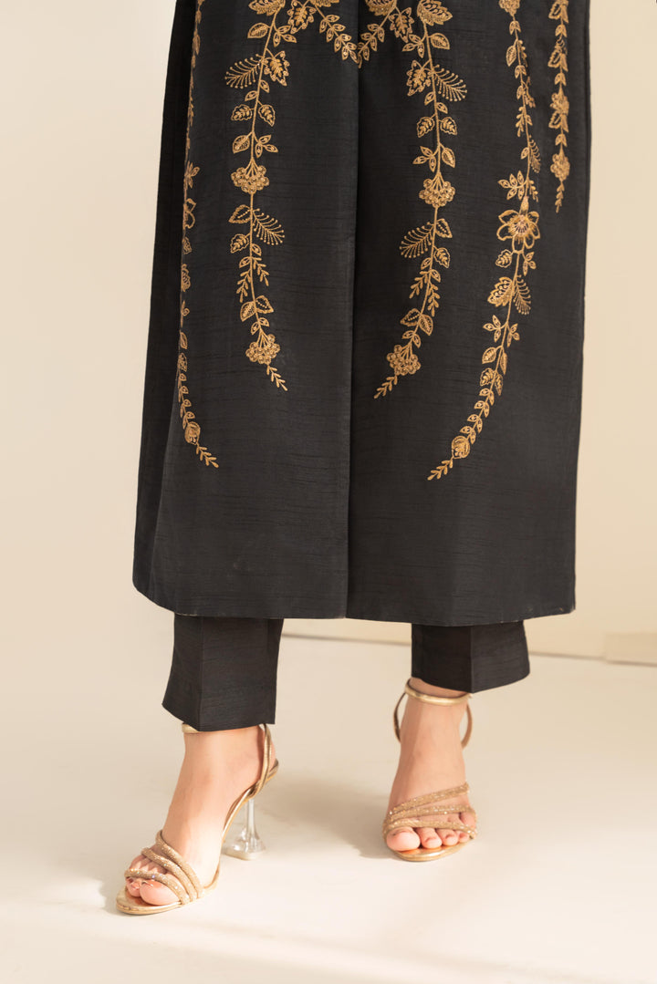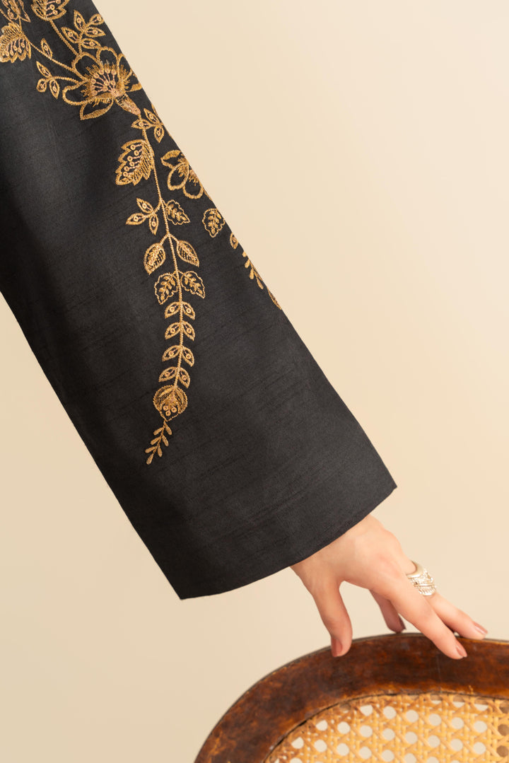 Elevate your style with our stunning black outfit, featuring a luxurious jacket made from raw silk, adorned with beautiful embroidery and zari work. Paired with black