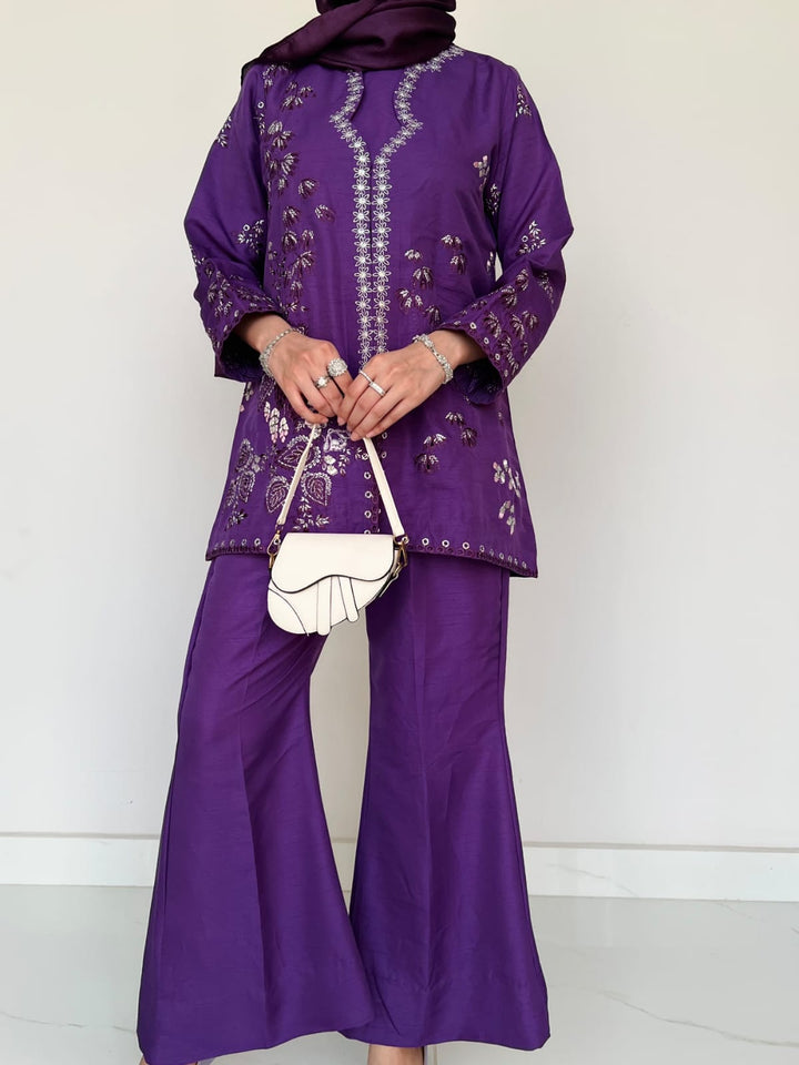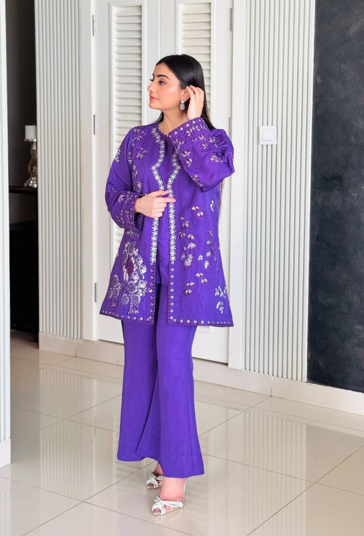 A vibrant purple front-open short jacket featuring luxurious embroidery, crafted with raw silk, Accompanied by a beautifully embellished inner adorned with pearl detailing at the neckline. This elegant ensemble is perfectly paired with Bell bottoms for a refined look.